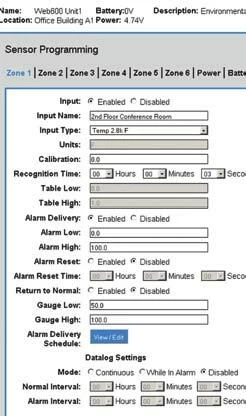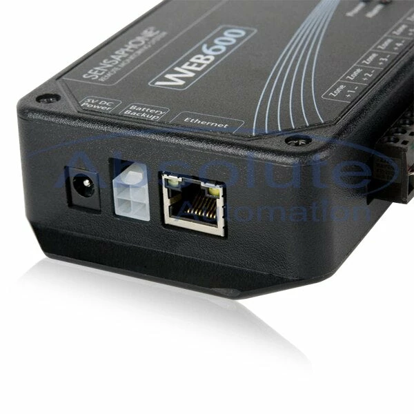 Six zone inputs allow for connection of normally open, normally closed, 2.8K or 10K thermisters and 4-20mA sensors. The WEB600 also has built in power failure monitoring.Â